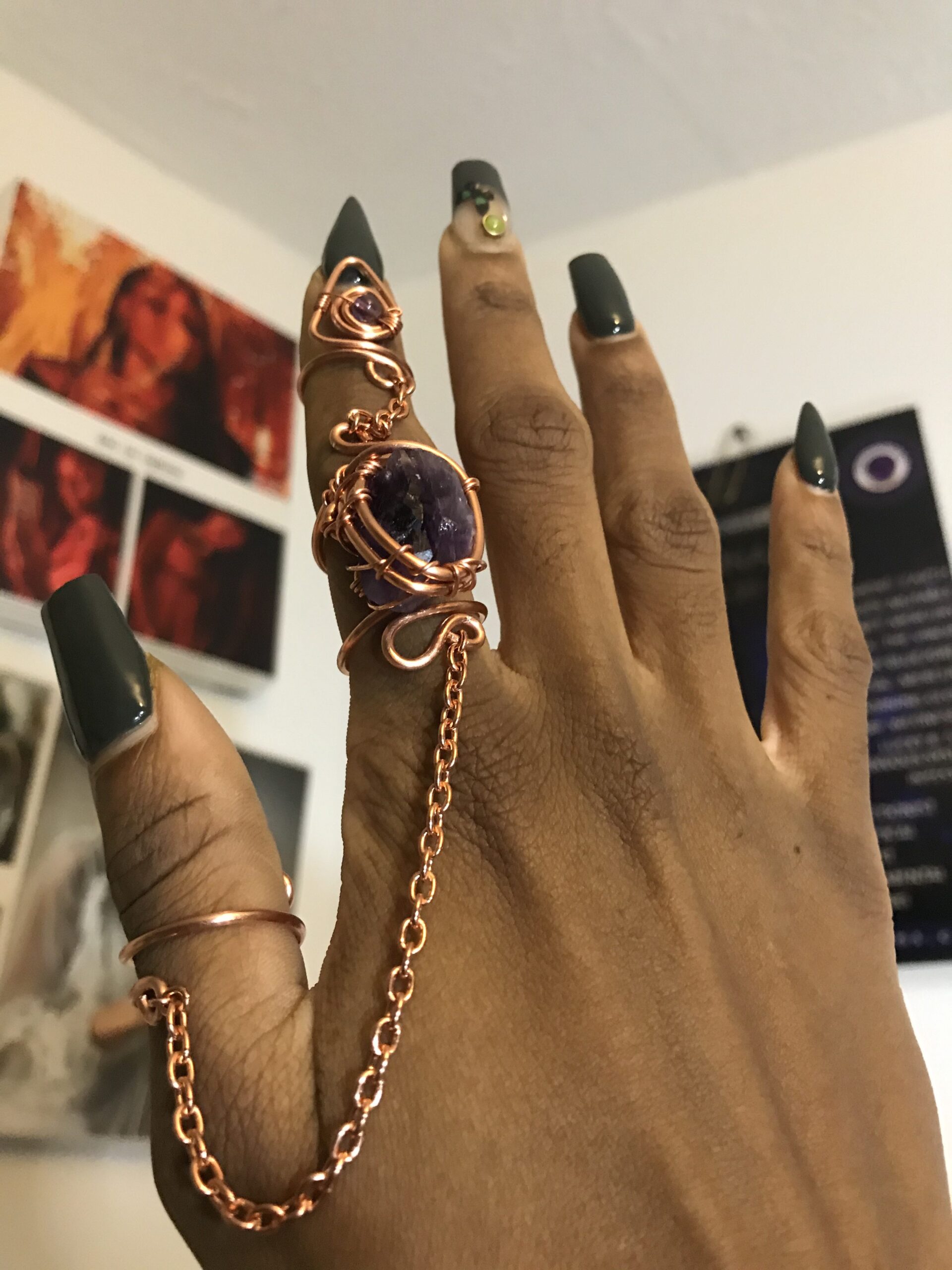 MADE TO ORDER. No two stones are alike but very similar.. swipe through the photos to get a better idea of the different shapes. Beautiful statement piece featuring big and bold amethyst stones. Amethyst stones are perfect for meditation , clarity, strength and intuition. Made with all natural copper and stones. All rings adjust and packaged in a Nontle gift box with love!