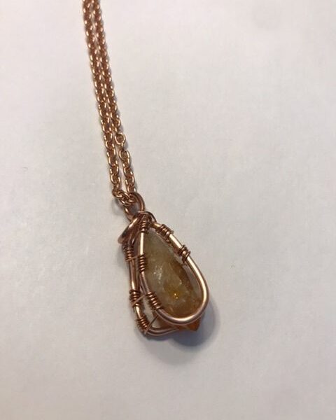 CompareCute citrine pendant for abundance, happiness, joy, manifestation grounding, connection to nature, emotional transformation and deflecting negativity. Copper and natural citrine Pendant. 18 inch chain with clasp.