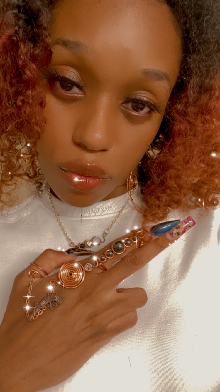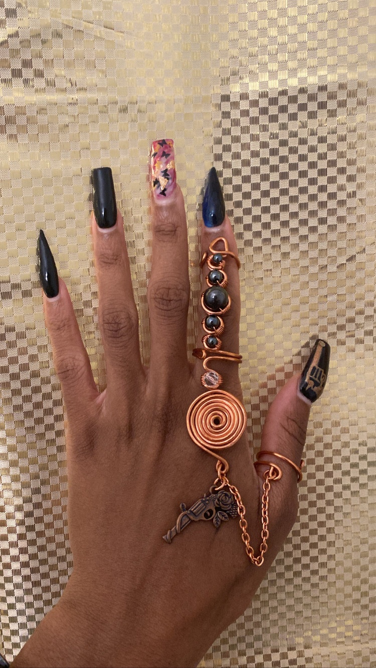Ring is made is natural hematite stones and natural copper. Choose ring size for a snug fit but rings are adjustable.