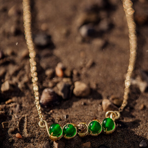 Brass wrapped fluorite on an 18 inch metal chain.