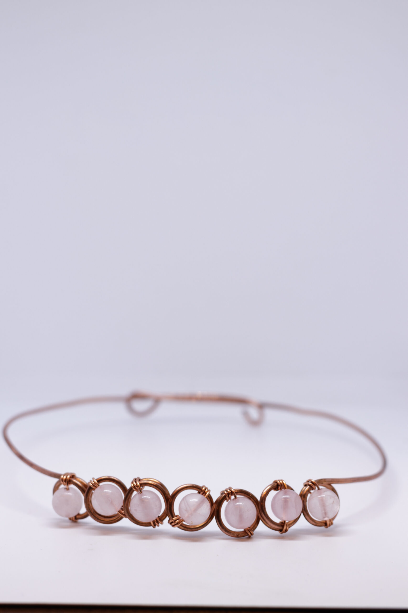 Simple tiara style rose quartz crown the perfect touch for self love rituals and one wishing to tend to self.