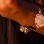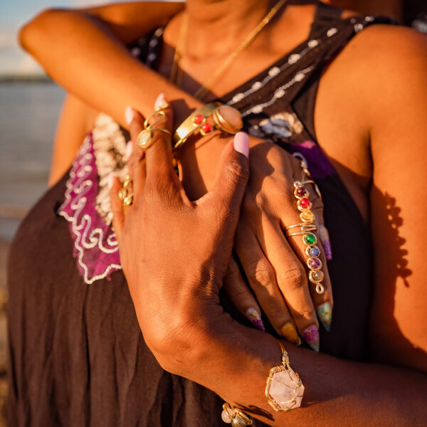 6 sided rose quartz pyramid brass wrapped bracelet with gold and rose quartz accents. Adjustable at 7 inches.