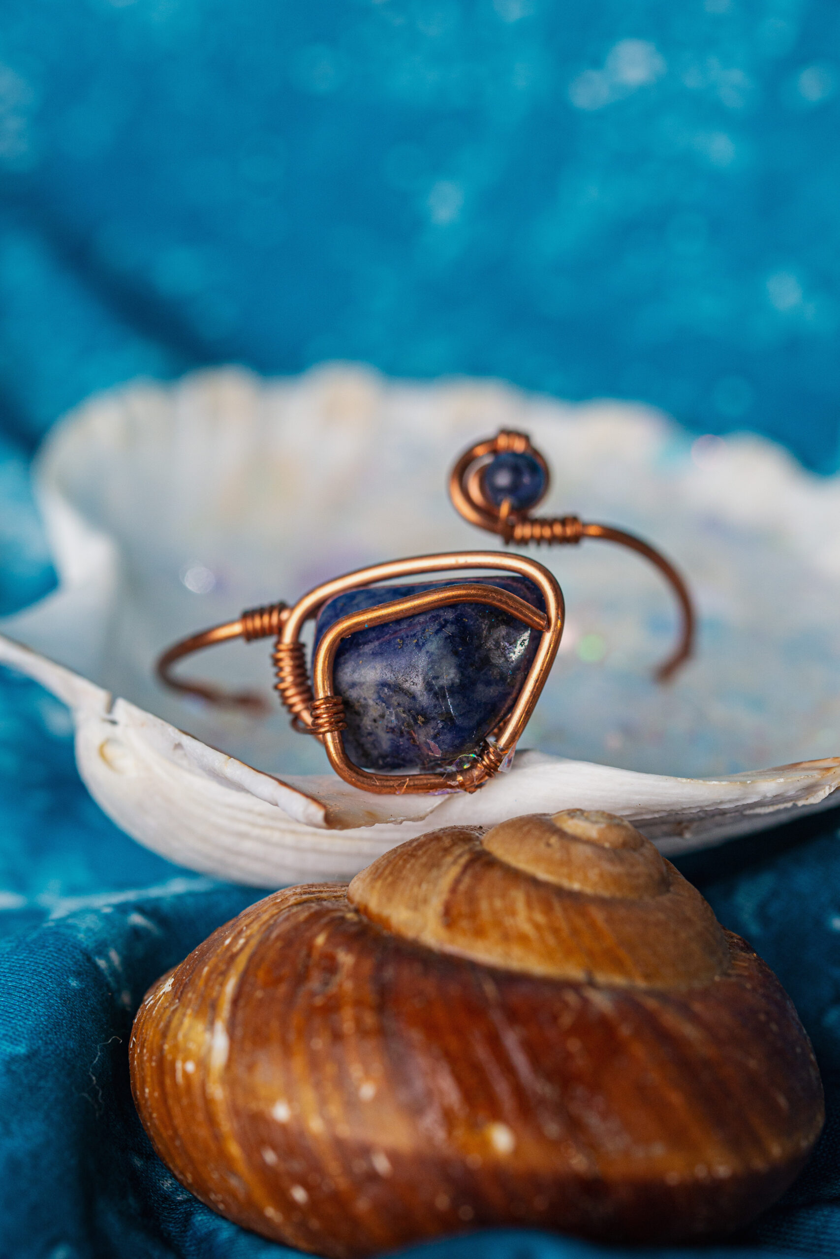 Turquoise and sodalite stones focused on Communication , expression and protection. Adjustable and natural copper bracelet.
