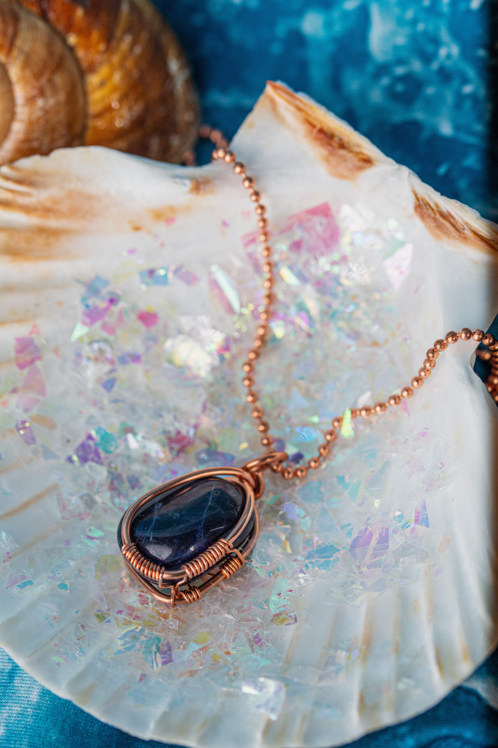 Raw Amethyst and polished sodalite stones for assistance with communication meditative and protective stones on an 20 inch copper ball chain. Comes in a Nontle gift box ready to gift to a special one!